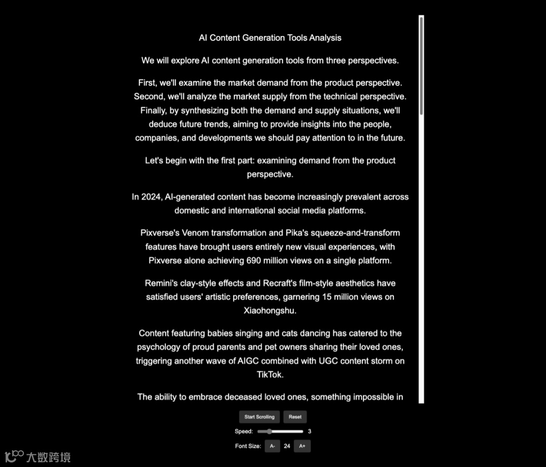 请将演讲稿传给Manus,它帮你生成一个网页版的提词器。滚动、速度等参数都还可以调。如下图所示: