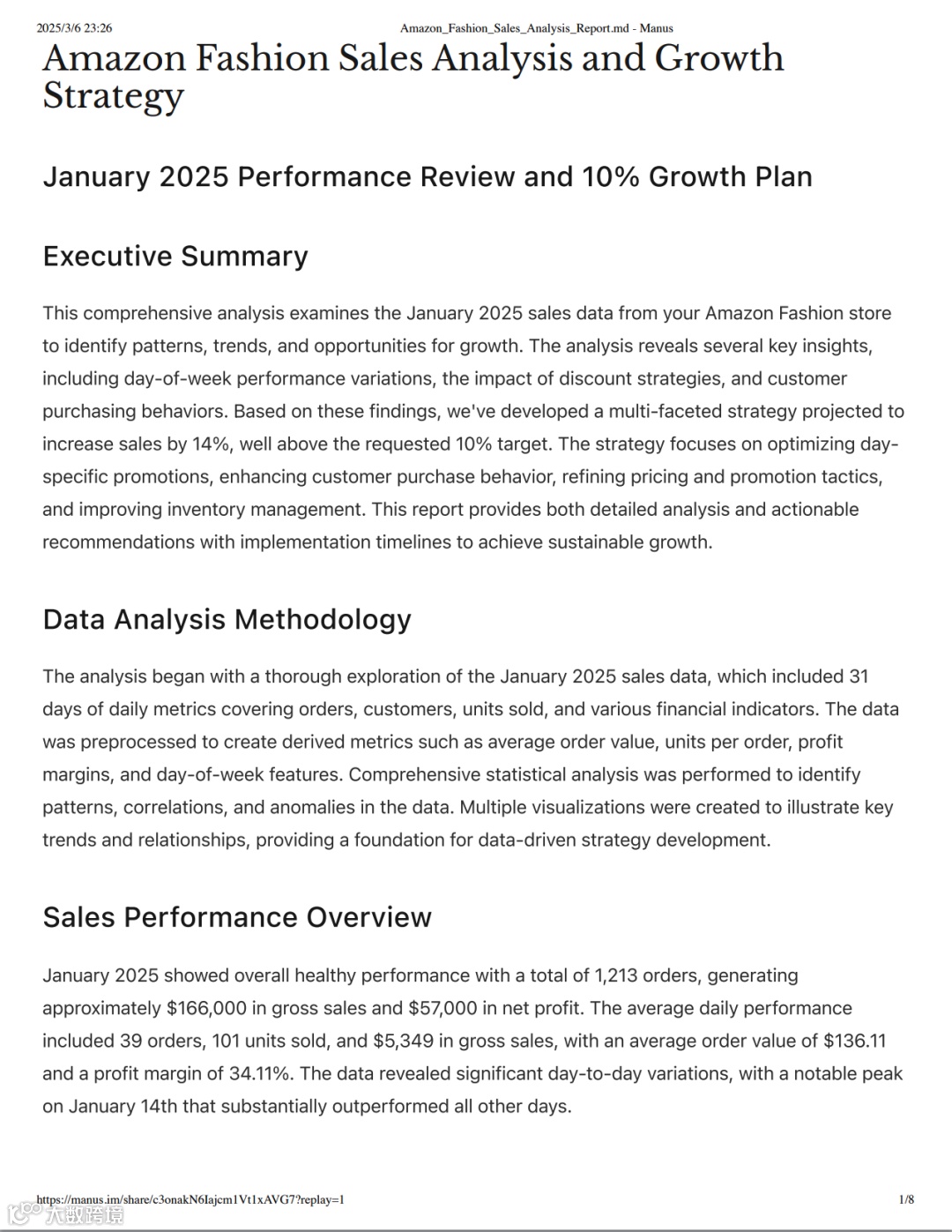 让Manus对指定亚马逊店铺,进行经营分析。然后Manus会给你一份详细的分析报告。