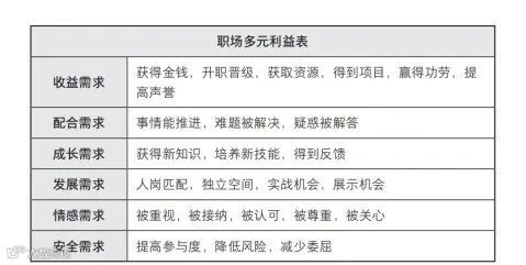 为此,王专老师在他的书中提到了一个简单好用的工具——职场多元利益表。表格中列举了了职场中常见的六类利益诉求,并细分出了25 个具体的利益点: