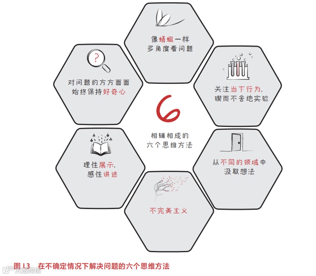 他们提出了六种核心的思考方法:对问题保持全面的好奇心、像蜻蜓一样从多个角度审视问题、专注于当前的行为、从完全不同的领域汲取灵感、接纳不完美并灵活应对、以及结合理性分析与感性表达。
