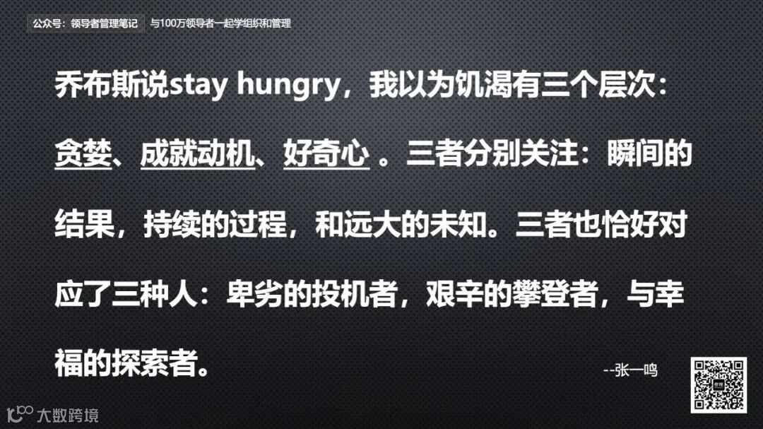 25.乔布斯说stay hungry,我以为饥渴有三个层次:贪婪、成就动机、好奇心 。三者分别关注:瞬间的结果,持续的过程,和远大的未知。三者也恰好对应了三种人:卑劣的投机者,艰辛的攀登者,与幸福的探索者。