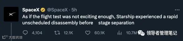 许多媒体机构在梳理整个故事线索上都十分吃力,大多认为此次发射是失败的。我承认,“计划外地快速拆卸”的说法十分有趣。不过,Starship 此次以及将来的试飞的关键在接下来的两条推文中已得到体现。