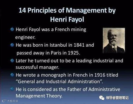 亨利·法约尔(Henri Fayol),法国古典管理理论学家,与马克斯·韦伯(Max Weber)、弗雷德里克·温斯洛·泰勒(Frederick Winslow Taylor)并称为西方古典管理理论的三位先驱,并被尊称为管理过程学派的开山鼻祖。法约尔与泰勒一样同属于管理学派,泰勒的理论侧重于在工厂中提高劳动生产率的问题,而法约尔则侧重于高层管理理论,他们的理论互为补充。