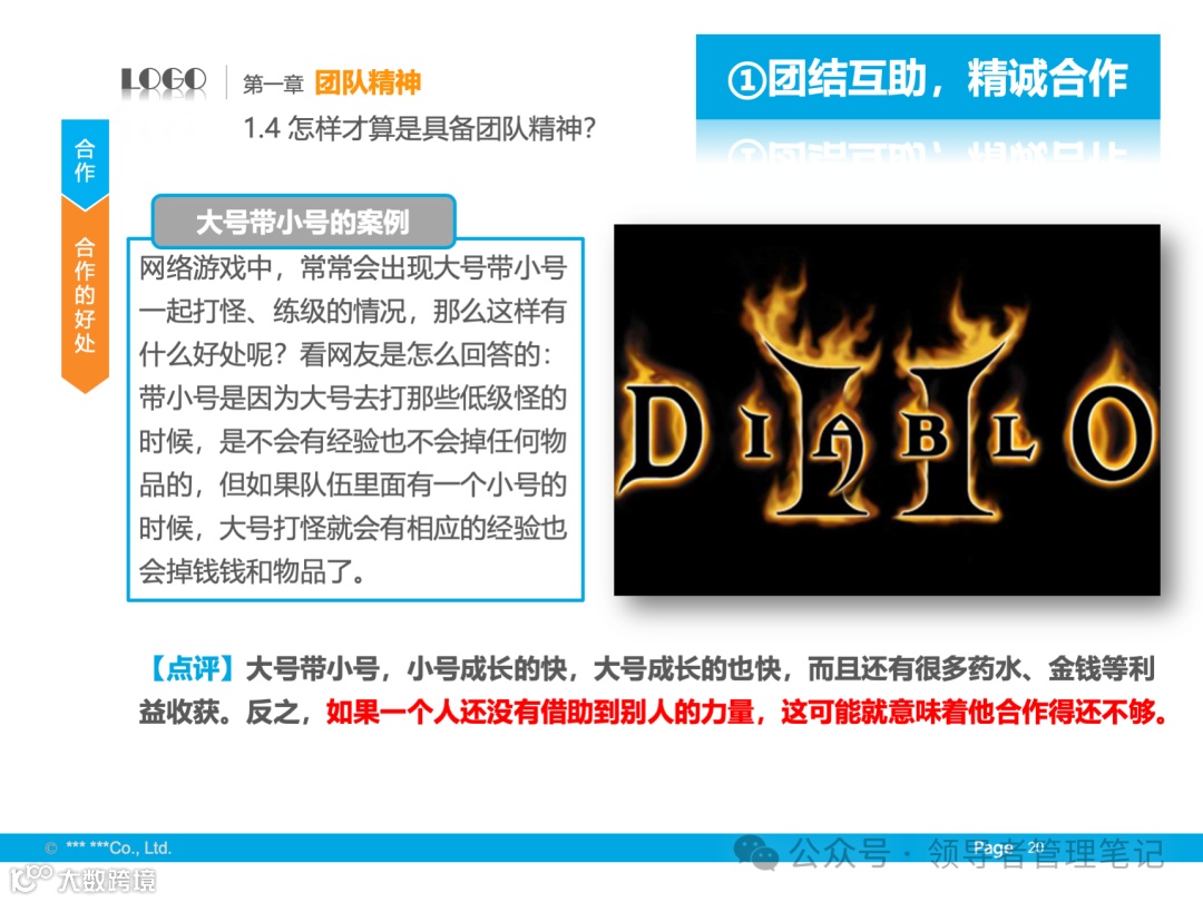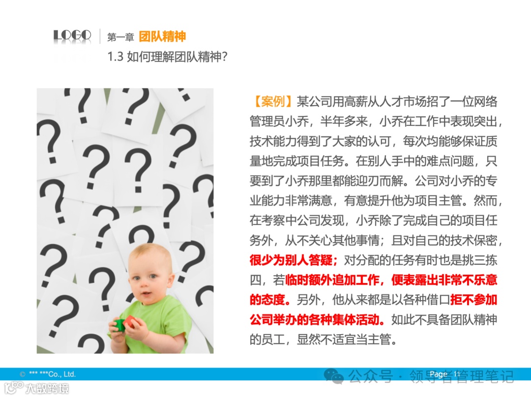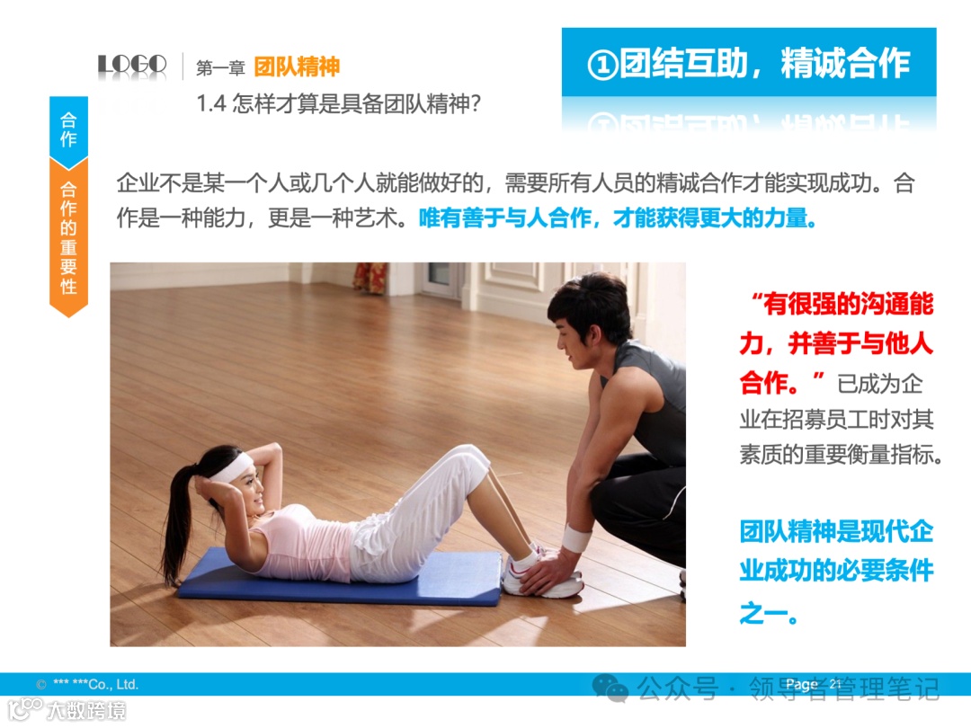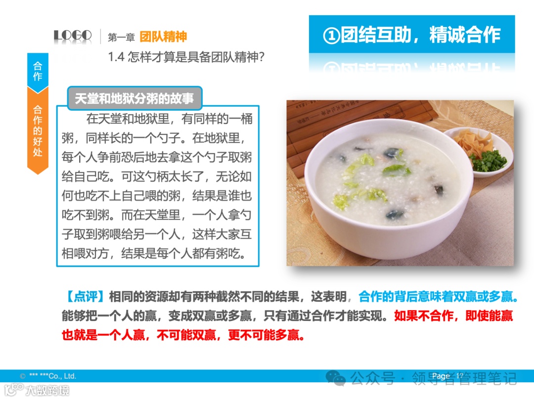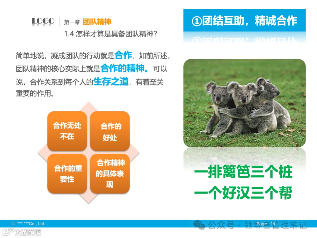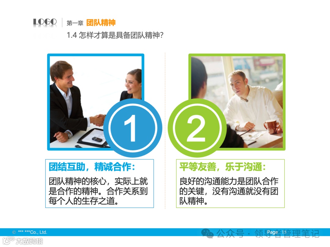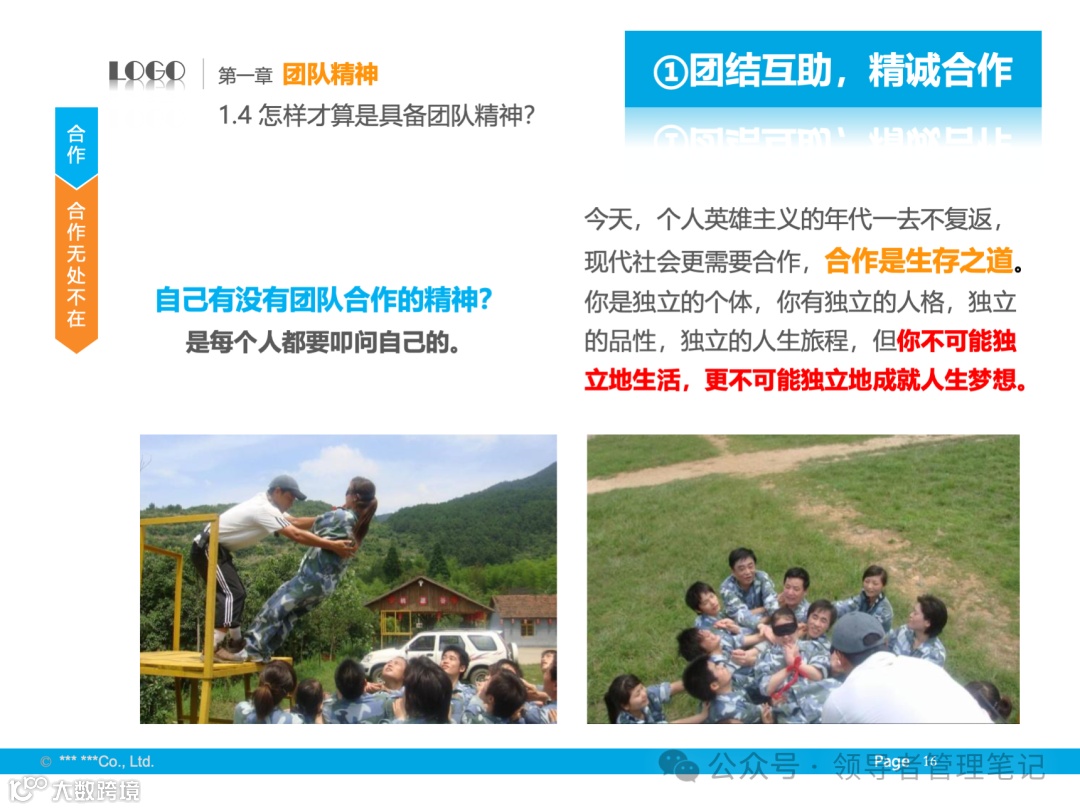 - 定义与核心:团队精神包括大局意识、协作精神和服务精神,核心是协同合作。