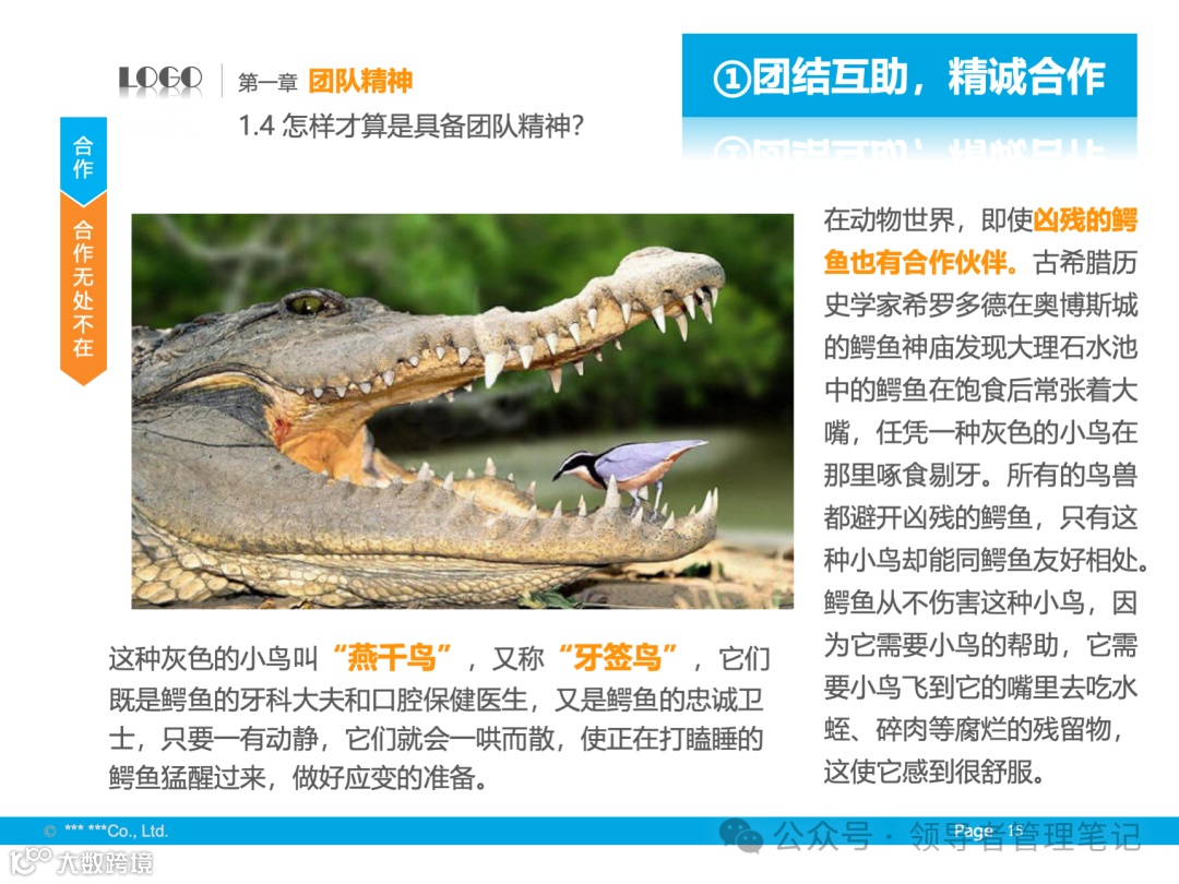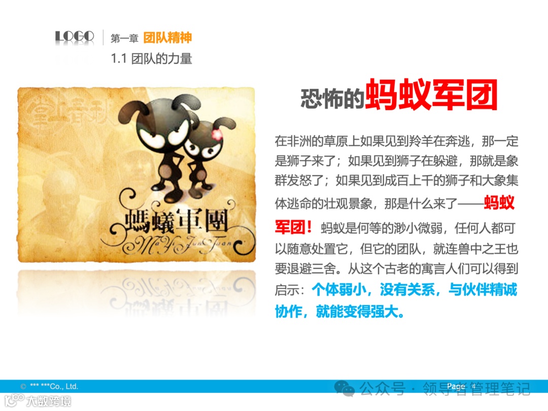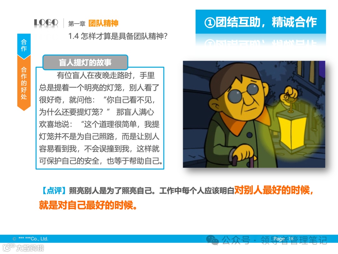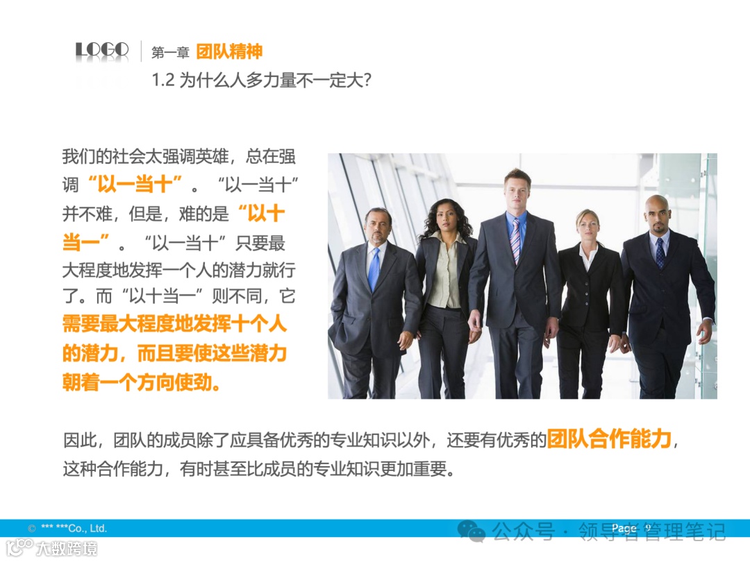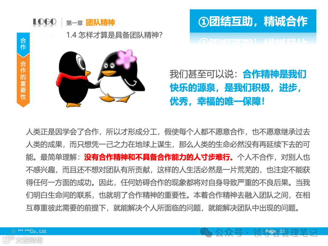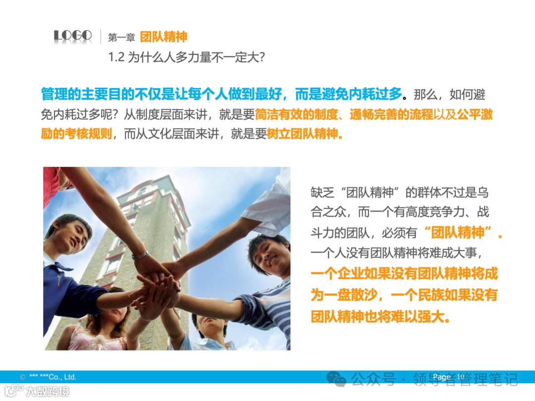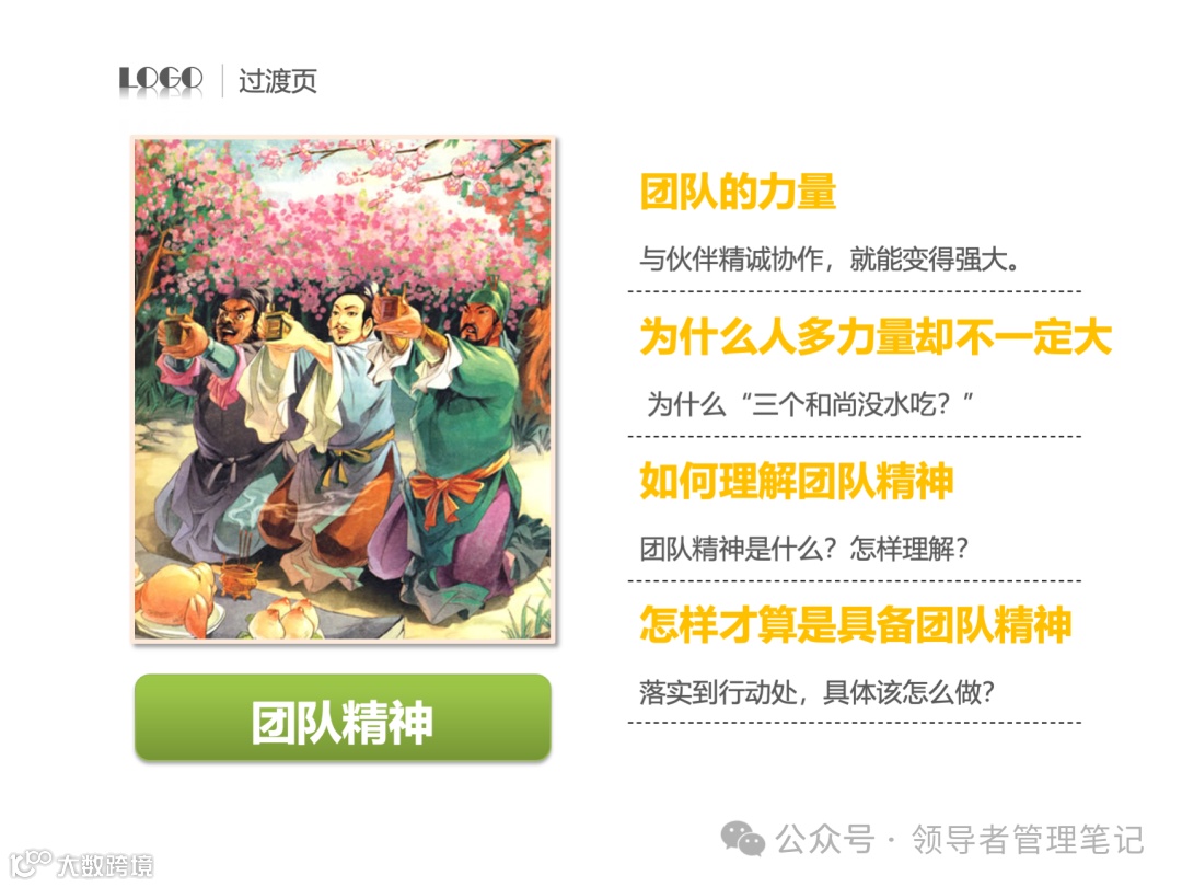 - 团队精神是指团队成员为实现共同目标而相互协作、共同努力的精神状态。团队的力量在于成员之间的协作与互补,通过集体的智慧和力量达成个人难以完成的任务。