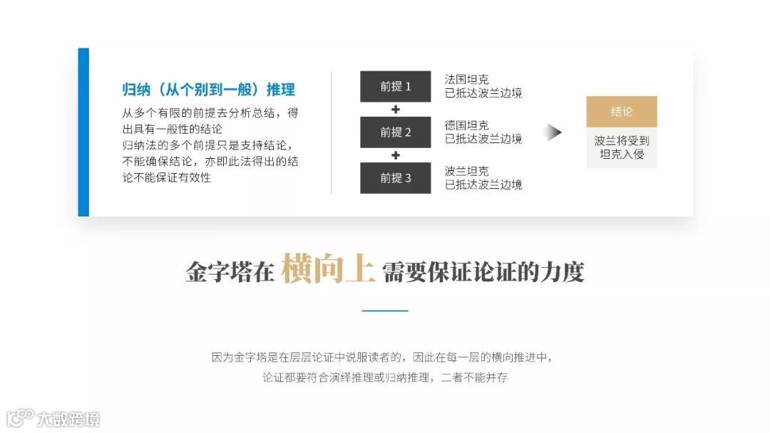 因为金字塔是在层层论证中说服读者的,因此在每一层的横向推进中,论证都要符合演绎推理或归纳推理,二者不能并存。