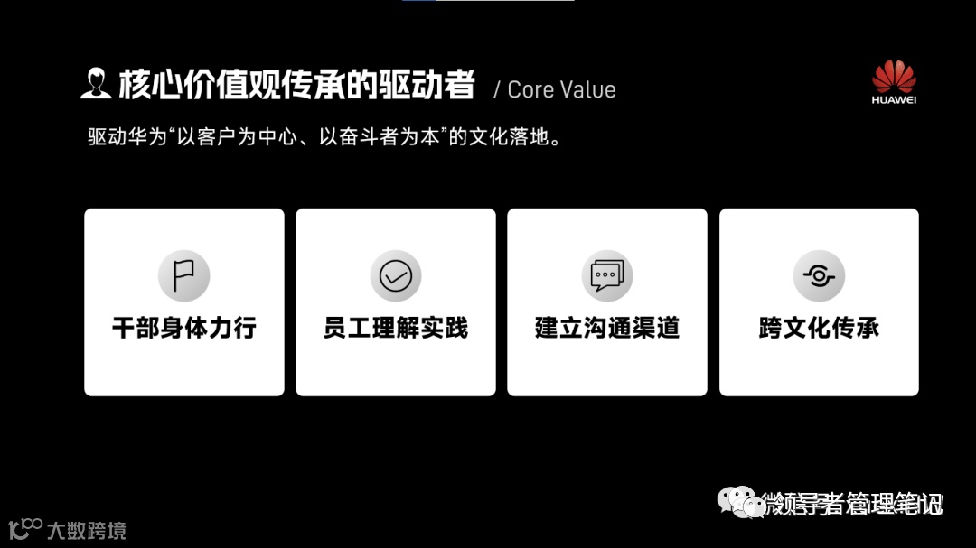HRBP通过对干部选拔、辅导和管理,让干部践行核心价值观,并通过干部大会等方式定期回顾和研讨;各级主管在业务管理和人员管理工作中,持续向员工传递核心价值观。