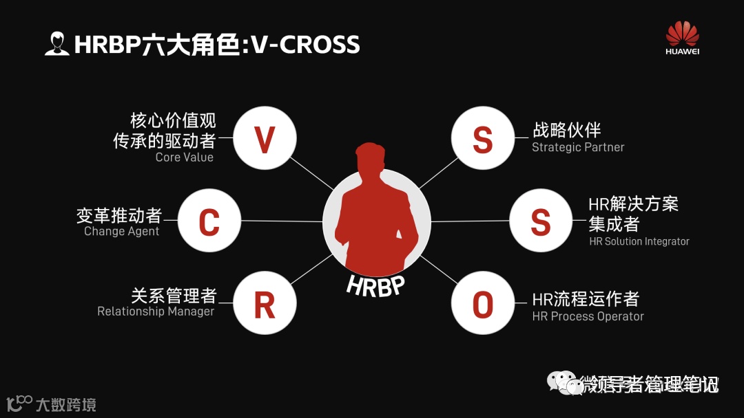 华为人力资源体系在转型“BP”的过程中,前后花了十几年的时间,逐渐形成了自己的一套成熟的HRBP的实践方法论,并成为业内学习的标杆。华为基于自身的HRBP实践,定义了BP的六大角色以及职责,总结提炼出了HRBP角色模型:V-CROSS。