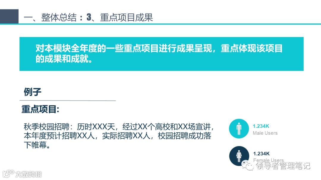 6. **致谢**:在结束时,对团队成员表示感谢。赞扬他们的努力和贡献,这也能展示你作为一个领导者的欣赏和认可。