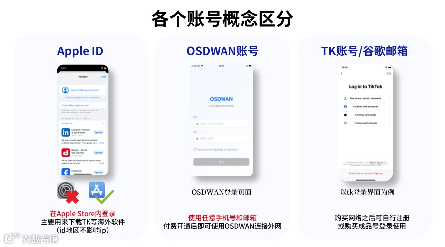 之后还会提到其他的账号,为了防止大家弄混,可以参考下图做一个简单的了解。这是三组不同的账号,不能混用的。