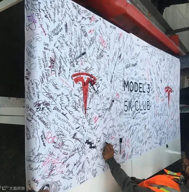 那天半夜,7 月 1 日凌晨 1 点 53 分,一辆黑色 Model 3 下线,挡风玻璃上挂着一条横幅:第 5000 辆。