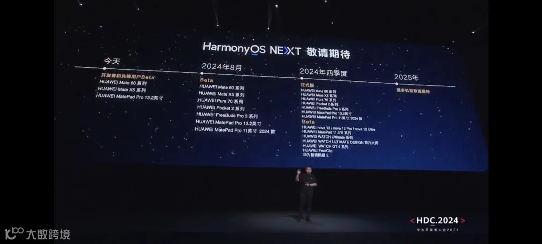 据余承东介绍,6月21日起,Harmony OS NEXT面向开发者启动Beta(测试)版,华为Mate 60系列、Mate X5、MatePad Pro 13.2英寸等多款设备即日开启升级。