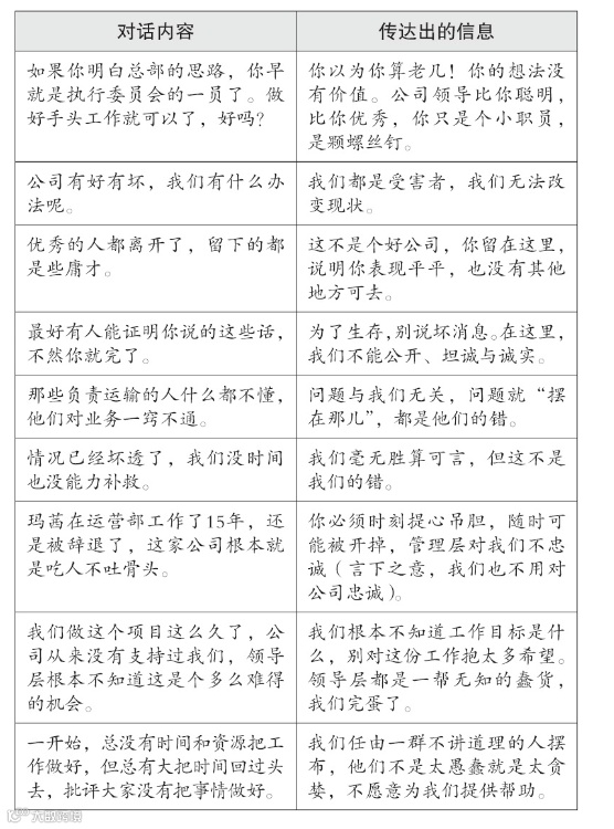 反之,我是不是很少和同事对话?在谈话中我是不是太敷衍了事了?我是不是没有投入情感?我是不是总是只关心手头的工作?更糟糕的是,我在谈话中是否尖酸刻薄,只会批评别人?是否会让同事感到害怕与沮丧?”
