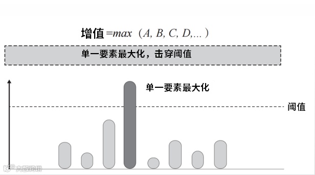 从数学上看,组合思维其实就是最大数思想,一种方式是找到最大、最能够击穿阈值(突破问题)的单一要素,然后把资源都投入这个单一要素,力出一孔,迅速地击穿阈值,如上图。