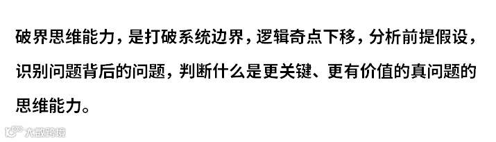 问题比答案更加重要,发问的能力比解决问题的能力更重要。破界思维能力,就是洞察本质的能力,其作用是揭开问题表象,抓住问题本质,打破原有系统的思维局限,开展更大边界更有价值的创新,而阻碍组织或个人破界或转型的难点就在于“既有心智”。