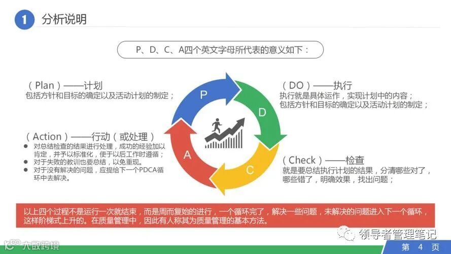 PDCA循环的四个过程不是运行一次就完结,而是周而复始地进行。一个循环结束了,解决了一部分问题,可能还有问题没有解决,或者又出现了新的问题,再进行下一个PDCA循环,依此类推。