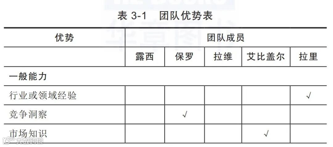 假设有一支5个人组成的团队,表1勾出了每个人的优势(你可以将评估对象改为任何类型的企业、职能部门或项目团队)。