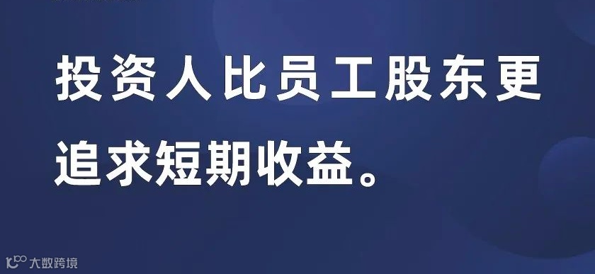 任正非认为,投资人比员工股东更追求短期收益。他在2019年的国际媒体圆桌上讲道:大家都看到,资本至上的公司成功的故事非常少。资本是比较贪婪的,它有利益就赶快拿走,失去对理想的追求。正因为我们是一个私营企业,所以我们才会对理想有孜孜不倦的追求。我们从几百人开始就对准一个“城墙口”冲锋,几千人、几万人、十几万人还是对准同一个“城墙口”冲锋。对着这个“城墙口”,我们每年研发经费的投入已经达到150亿~200亿美元,未来五年总研发经费会超过1000亿美元。资本公司看好的是一个漂亮的财务报表,我们看好的是未来的产业结构,因此,我们的决策体系是不一样的。我们很简单的,为人类进入信息社会而奋斗。