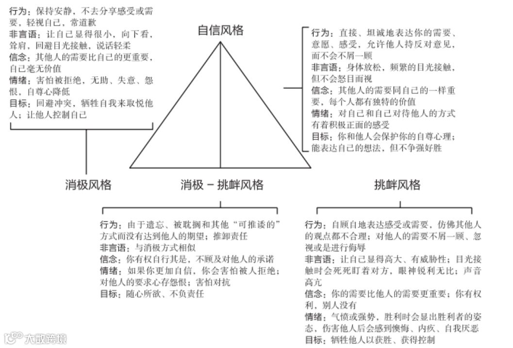 自信风格是四种交流风格之一,这些交流风格还包括消极、挑衅、消极-挑衅,而且这四种风格会交替出现。
