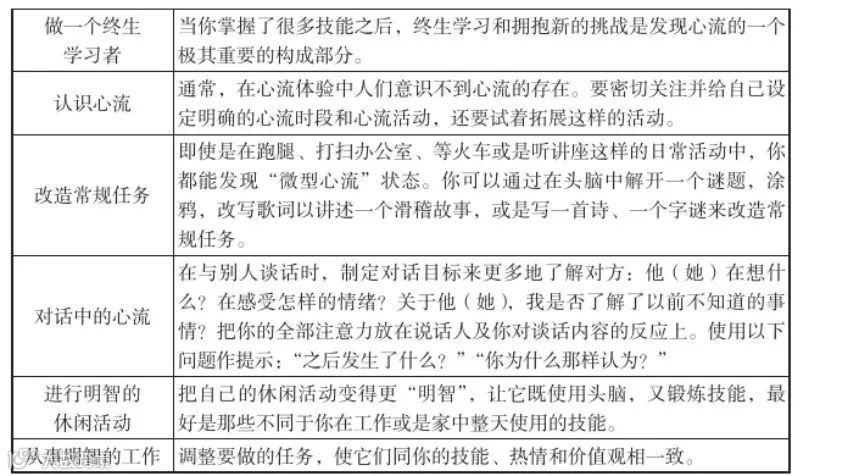 下表中呈现了八种增进心流体验的手段: