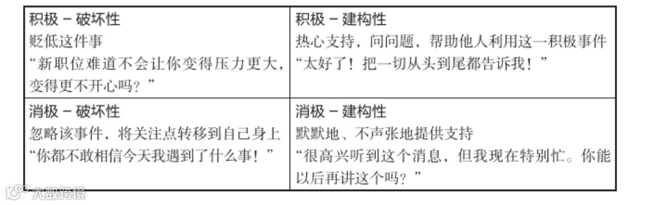 如今,利用积极建设性回应的技巧,科学家对这一点做出了详尽的阐释。练习这一技巧,其语境设定在对积极消息做出的回应上。