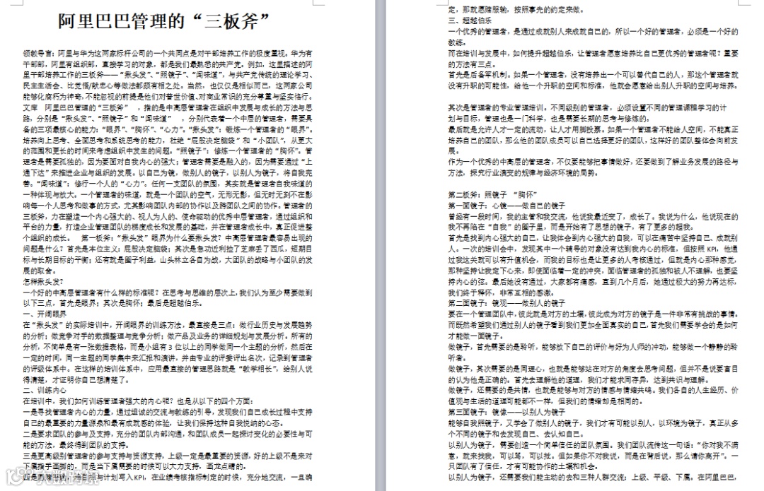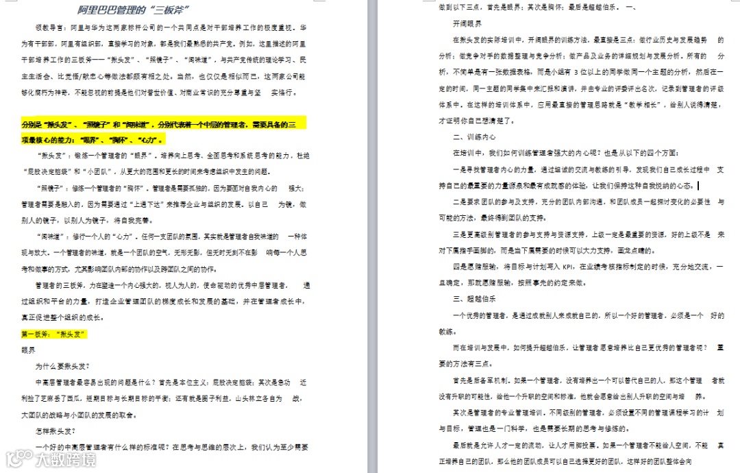►领导者说:★阿里巴巴管理的“三板斧” 指的是中高层管理者在组织中发展与成长的方法与思路分别是“揪头发”、“照镜子”和“闻味道” 分别代表着一个中层的管理者需要具备的三项最核心的能力“眼界”、“胸怀”、“心力”。