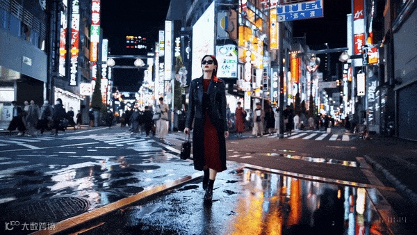 “一位时尚的女士在充满温暖发光的霓虹灯和动画城市标志的东京街道上行走。她穿着黑色皮夹克,一条长红裙和黑色靴子,背着黑色手提包。她戴着太阳镜和红色口红。她走路自信而随意。街道潮湿而具有反射性,营造出五光十色灯光的镜面效果。许多行人在四处走动。”