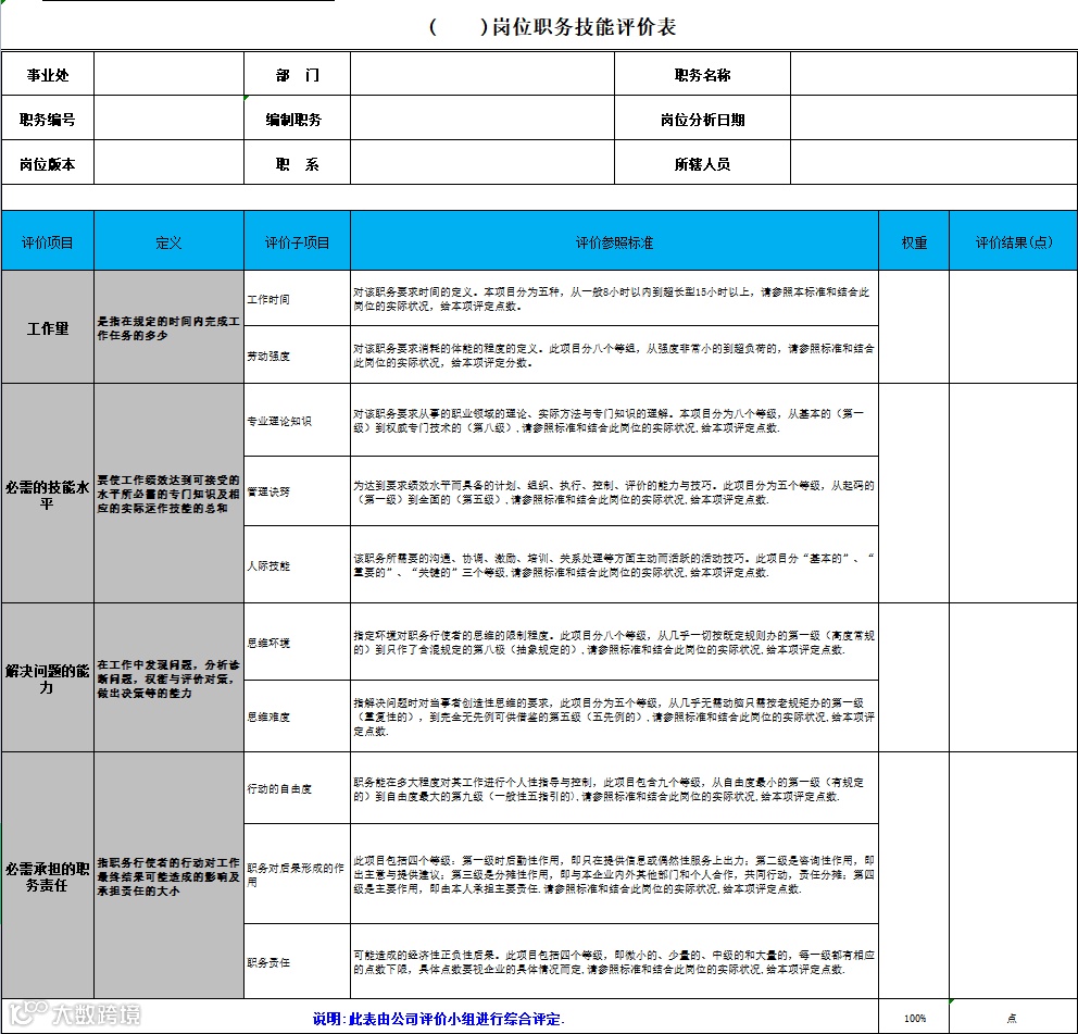 本套资料包含员工岗位能力评价表、岗位负荷测评表、岗位职务技能评价表、员工岗位素质测评表、管理干部岗位级别测评表、企业管理人员岗位测评表、干部任职测评表、自动统计岗位测评表等,预览如下: