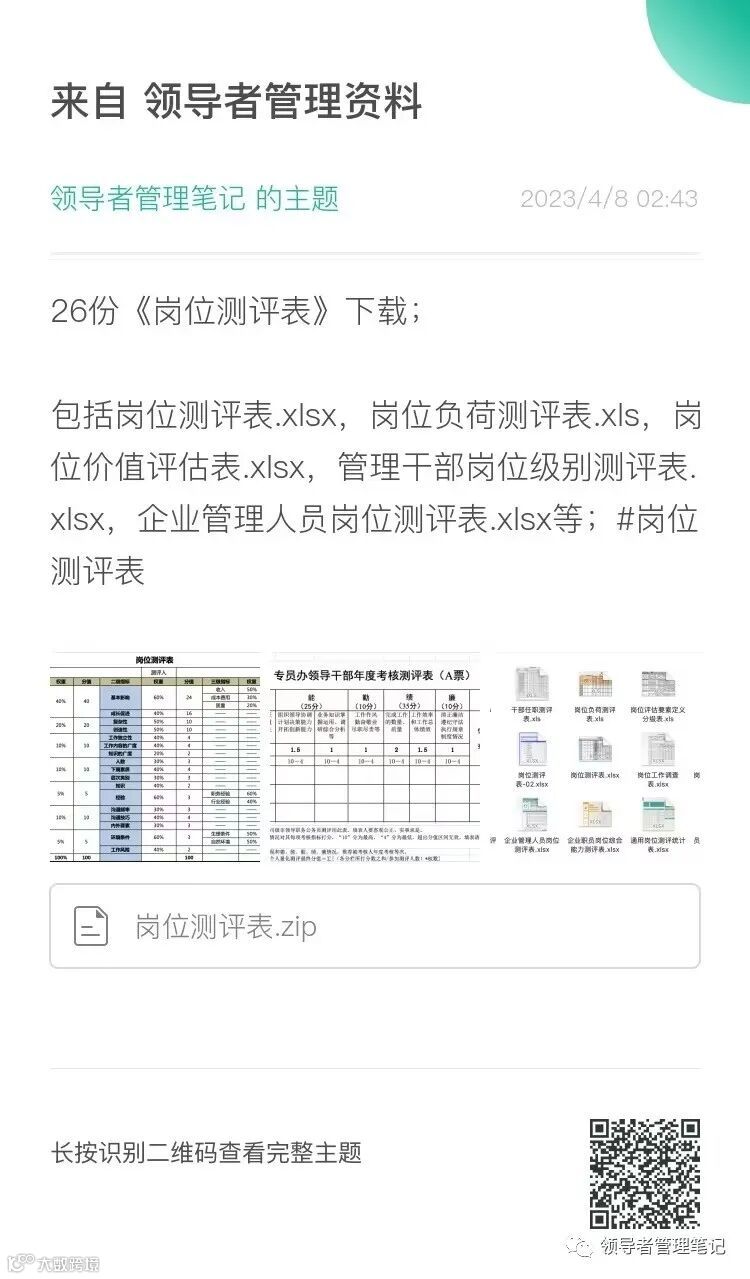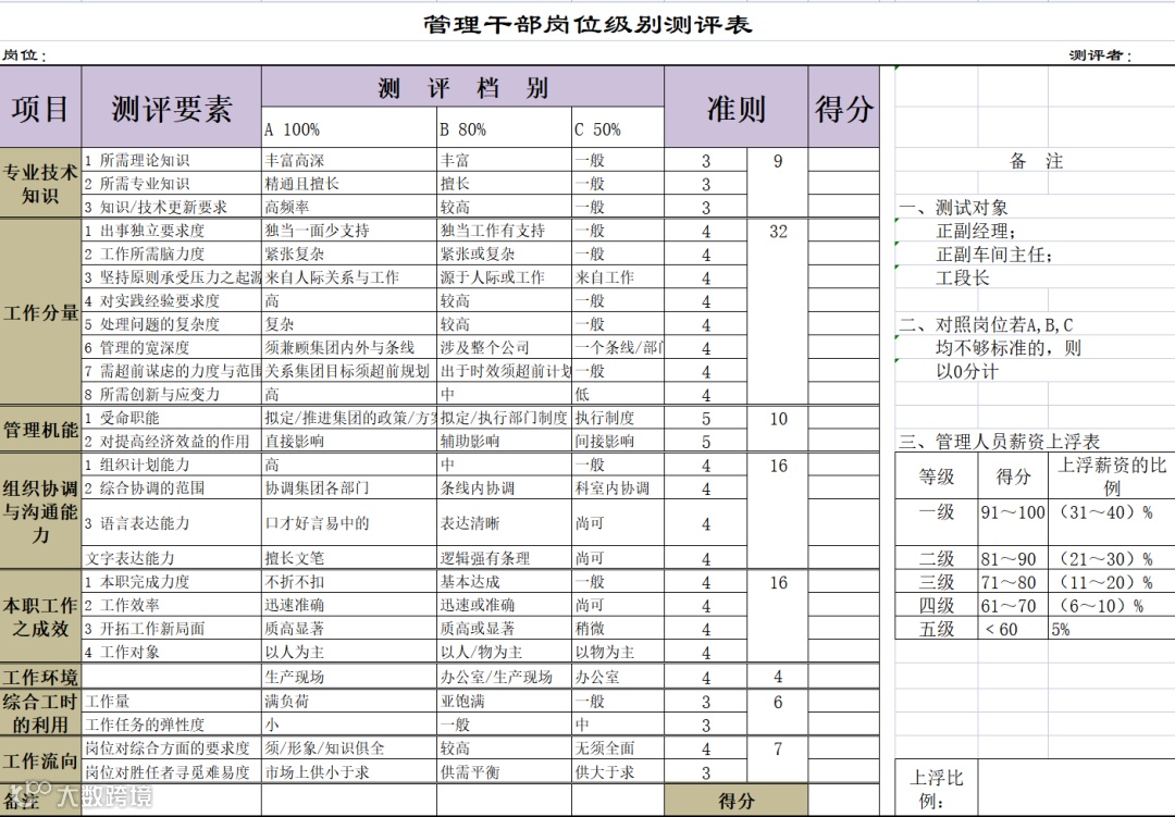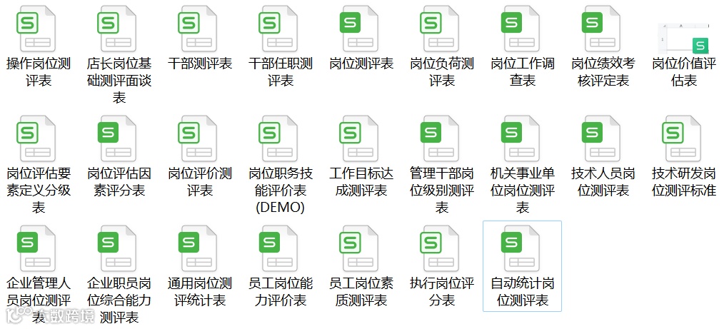 ►领导者说:★包括岗位测评表.xlsx,岗位负荷测评表.xls,岗位价值评估表.xlsx,管理干部岗位级别测评表.xlsx,企业管理人员岗位测评表.xlsx等。