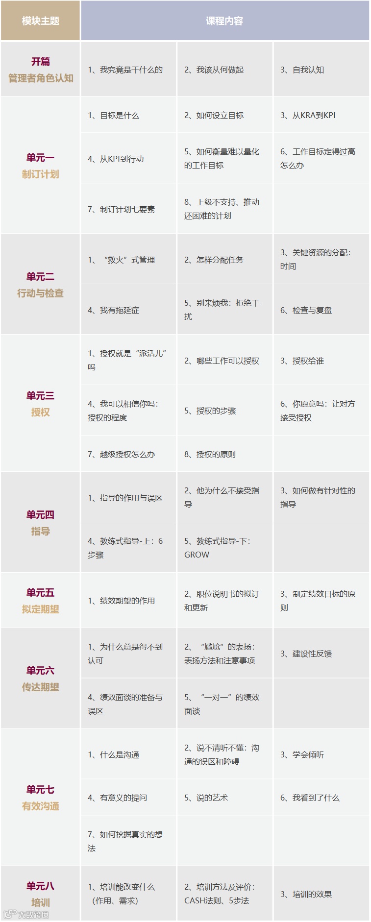 从管理者的角色认知入手,让管理者在学习后,迅速掌握"把事情做对"的能力,提高管理工作的计划性和执行力,学会授权下属的方法,有效的指导下属工作,制定清晰的绩效期望,培养有效的沟通能力,帮助管理者带领团队走向卓越。