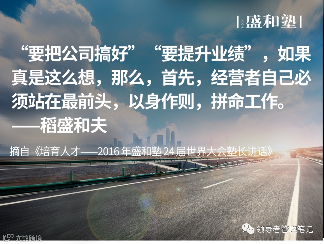 特别是中小企业,可以依靠的人不多,社长更要率先垂范,付出不亚于任何人的努力。这是引导企业成长发展的必要条件。