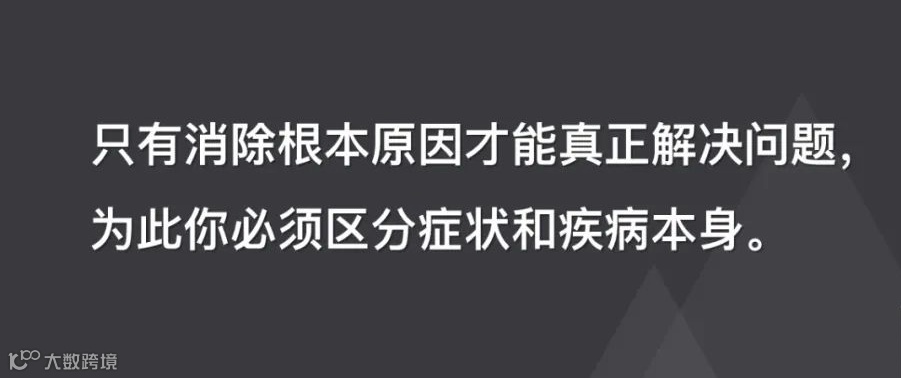 根本原因是更深层的原因,通常用形容词描述(我因为健忘而没有查列车时刻表)。只有消除根本原因才能真正解决问题,为此你必须区分症状和疾病本身。