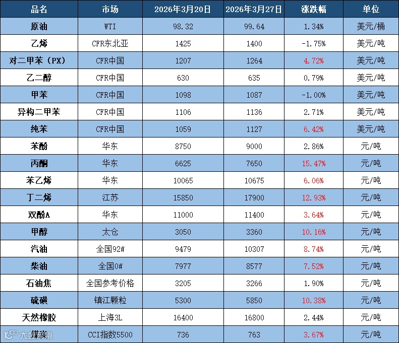 原油:国际原油价格上涨,主要的影响因素是伊朗宣布关闭霍尔木兹海峡,且美国方面不断调集军力去往中东地区,市场担忧冲突仍难结束,供应风险延续,支撑油价上行。截至3月27日收盘,纽约交易所WTI原油主力合约收盘至99.64美元/桶,伦敦洲际交易所布伦特原油主力合约收盘至112.57美元/桶,上海原油主力合约以740.8元/桶收盘。
