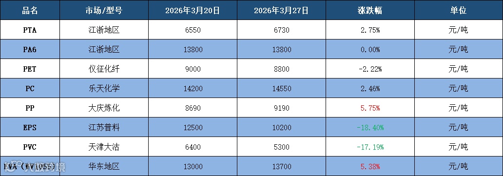 PET:本周期聚酯瓶片市场价格震荡下滑。截至周四,华东市场聚酯瓶片水瓶级现货周均价8454元/吨,较上周跌335元/吨,跌幅3.81%.受上游原料价格回调影响,成本支撑减弱;同时下游对高价抵触情绪升温,终端采购仅以刚需补库为主,市场整体成交活跃度低迷,价格传导受阻,呈现震荡下行态势。虽部分货源流通性偏紧,但部分终端原料库存释放,市场整体供应压力边际有所缓解。此外,中东局势存在不确定性,市场观望情绪浓厚,交投谨慎。