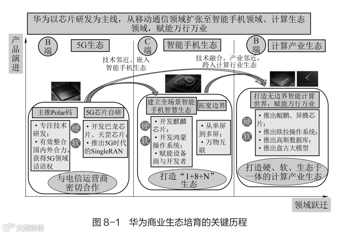 华为通过硬件层面芯片研发的不断深入推进,软件方面标准、操作系统的迭代创新,不断积蓄优势,实现了从移动通信技术领域向智能手机、计算产业再至赋能万行万业的渐次跃迁,在此过程中,它所构筑的生态领域也在不断扩张。