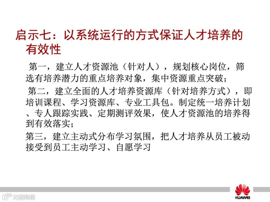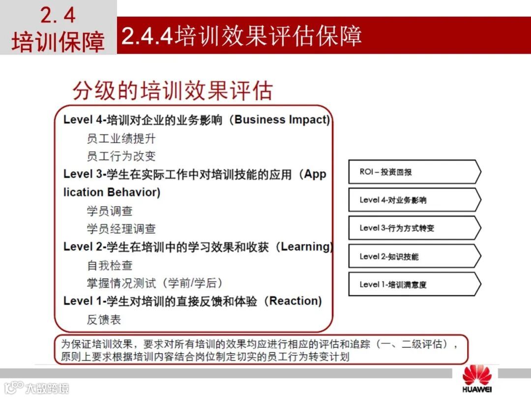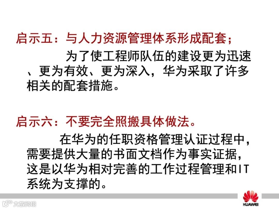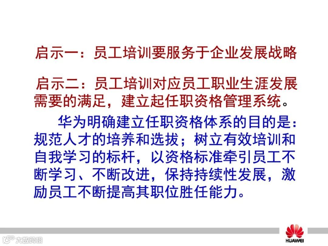 ►领导者说:★华为员工培训对应员工职业生涯发展需要的满足,建立起任职资格管理系统。华为明确建立任职资格体系的目的是:规范人才的培养和选拔;树立有效培训和自我学习的标杆,以资格标准牵引员工不断学习、不断改进,保持持续性发展,激励员工不断提高其职位胜任能力。获取PPT原件请见文末。