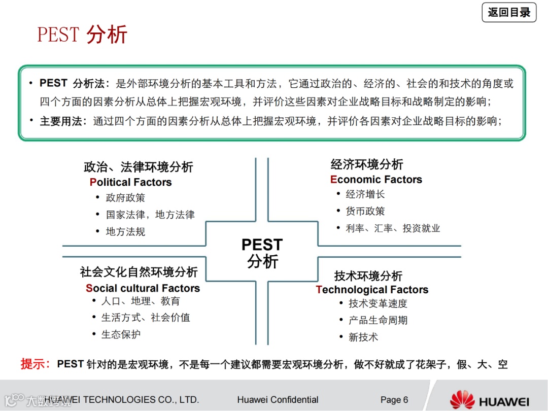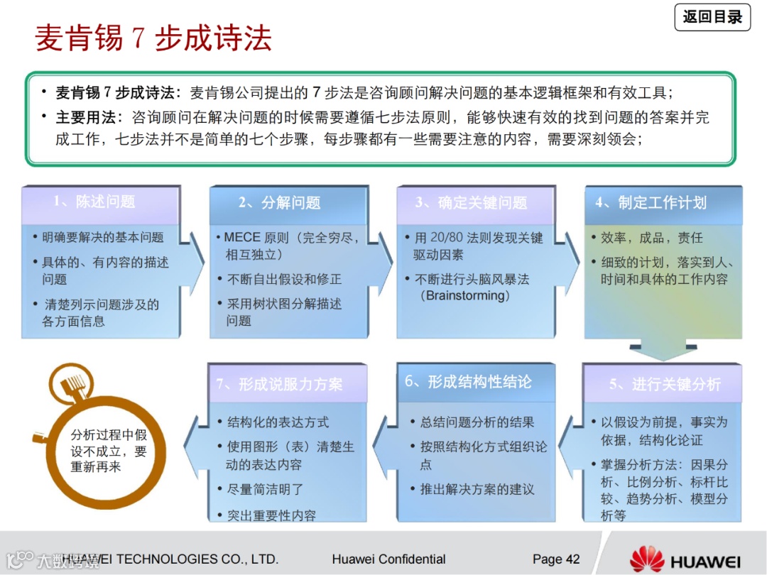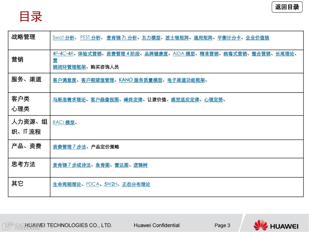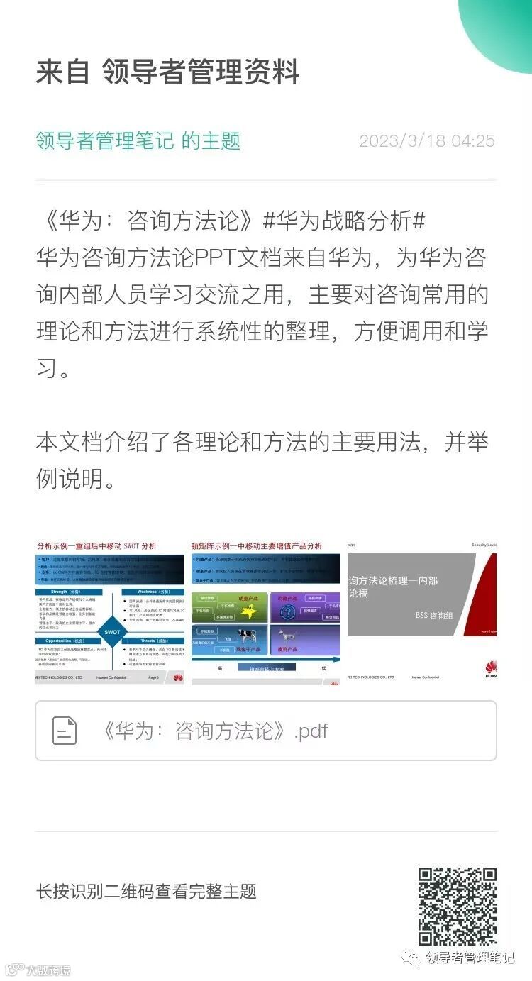 ►领导者说:★咨询方法论PPT文档来自华为,为华为咨询内部人员学习交流之用,主要对咨询常用的理论和方法进行系统性的整理,方便调用和学习。本文档介绍了各理论和方法的主要用法,并举例说明,大家可以直接调用框架,修改内容后即可使用。