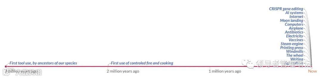 只要将镜头拉远,你会发现大部分的人类创新都发生在非常非常近的时期。我们花了很长时间才弄清楚如何使用工具;我们又花了一百万年的时间来学习如何控制火,接着又花了一百万年的时间自学农业。
