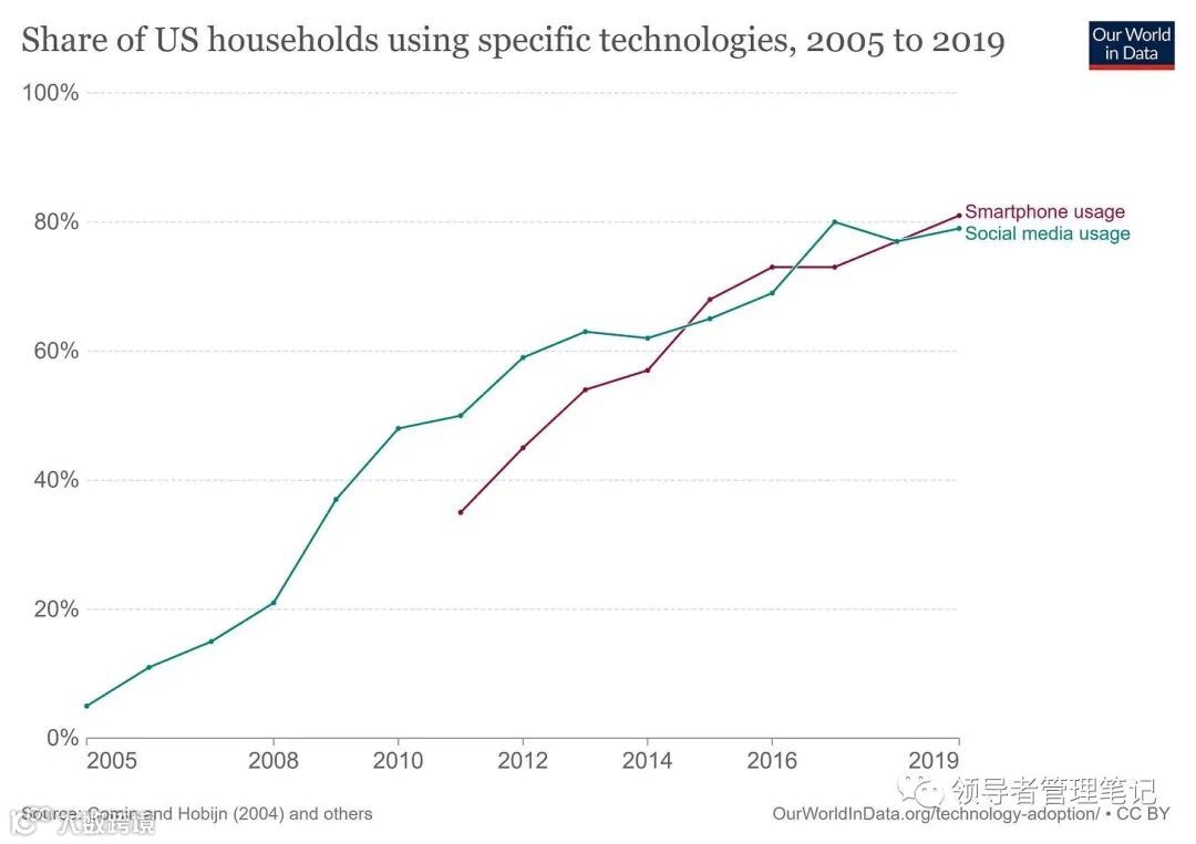 他其实是在暗示智能手机及社交媒体的兴起与青少年心理健康恶化是直接相关的,这也是 Twenge 的论点。下面这张图跟踪了智能手机与社交媒体的采用情况: