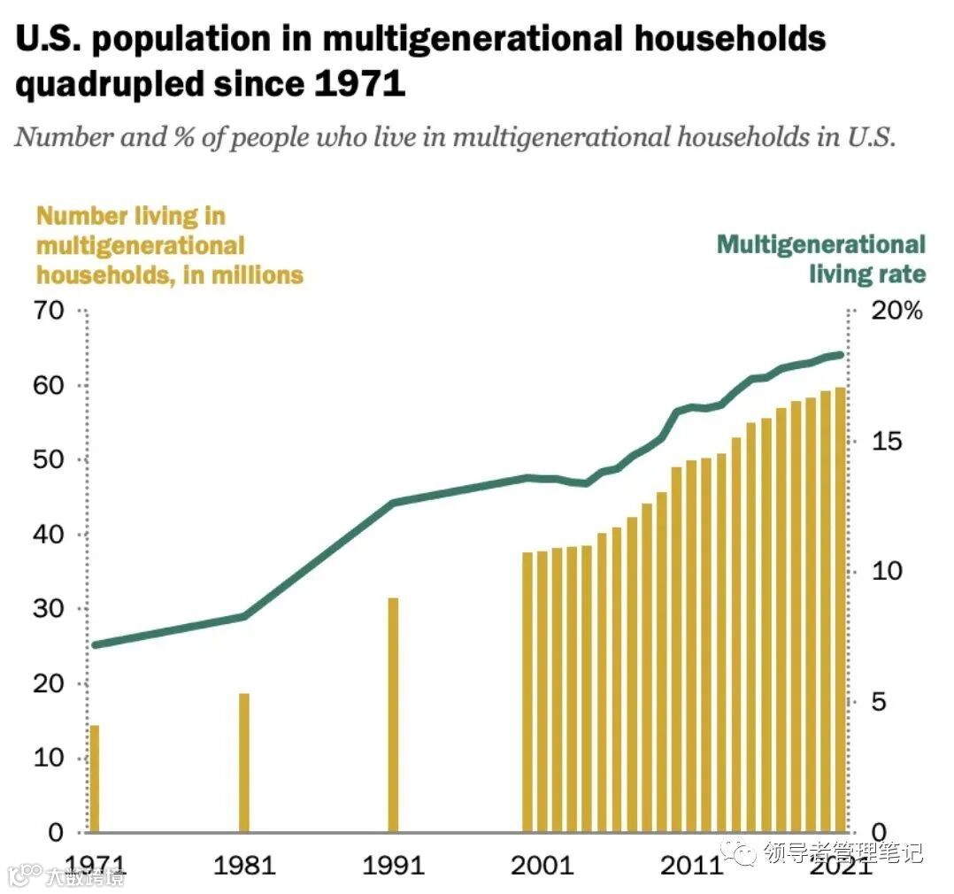 难道就没有一点可取之处?多代家庭的增加。1970 年代那时候,只有 7% 的美国人属于多代同堂(有两代或更多代人住在同一屋檐下);到 2021 年,这个数字已经高达 20%(见下图)。