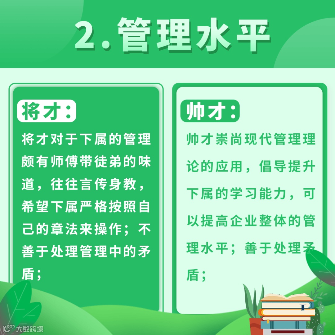 帅才:帅才崇尚现代管理理论的应用,倡导提升下属的学习能力,以提高企业整体的管理水平;善于处理矛盾;