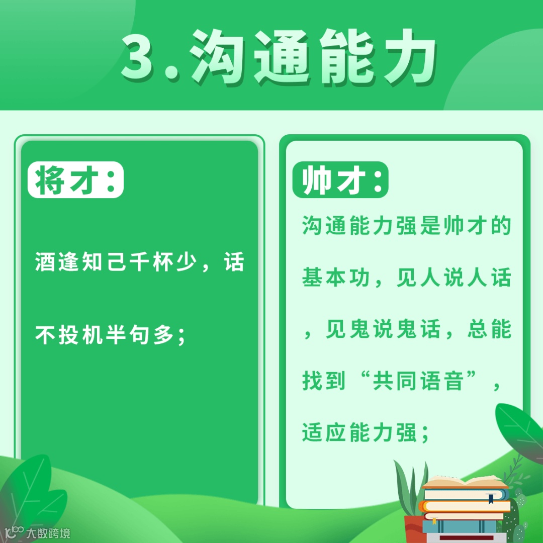 帅才:沟通能力强是帅才的基本功,见人说人话,见鬼说鬼话,总能找到“共同语音”,适应能力强;