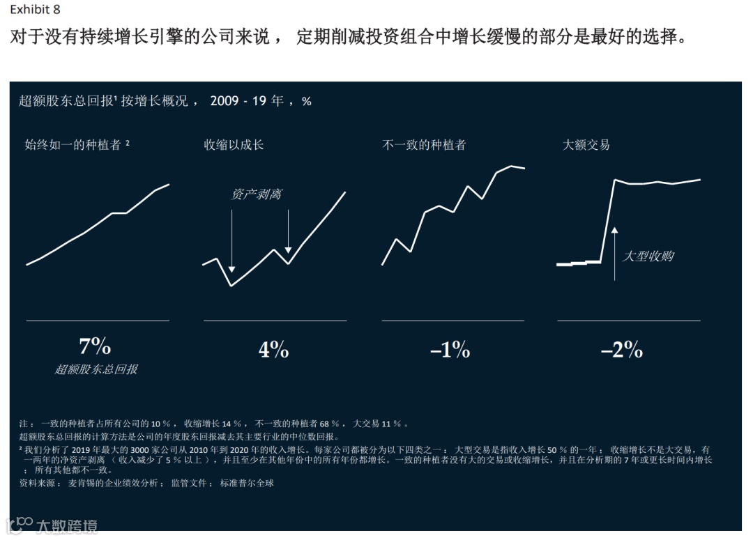 最糟糕的事情你可以做的是尝试用 “大爆炸 ” 购买增长投资组合,例如保险,并将收益投入增长机会。其股东获得了丰厚的回报,从 2009 年到 2019 年, TSR 每年超 过 10 %。收购,你最好的选择是定期通过剥离你生长缓慢的部分来修剪投资组合并将收益再投资到新领域 (图表 8) 。