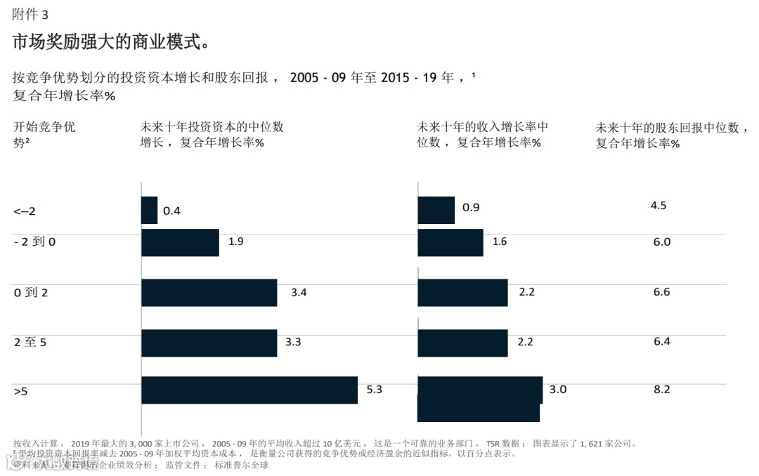 高投资资本回报率 (ROIC) 表明一种由竞争优势驱动的商业模式。产生更高回报的公司吸引和部署更多的资本,这是一种良性的周期,使他们能够更快地增长并产生更高的回报(图表 3 )。虽然一些公司为了追求增长而放弃利润一段时间(亚马逊也许是最知名的),但更典型和实用的方法是建 立一个独特的商业模式,然后扩大它。