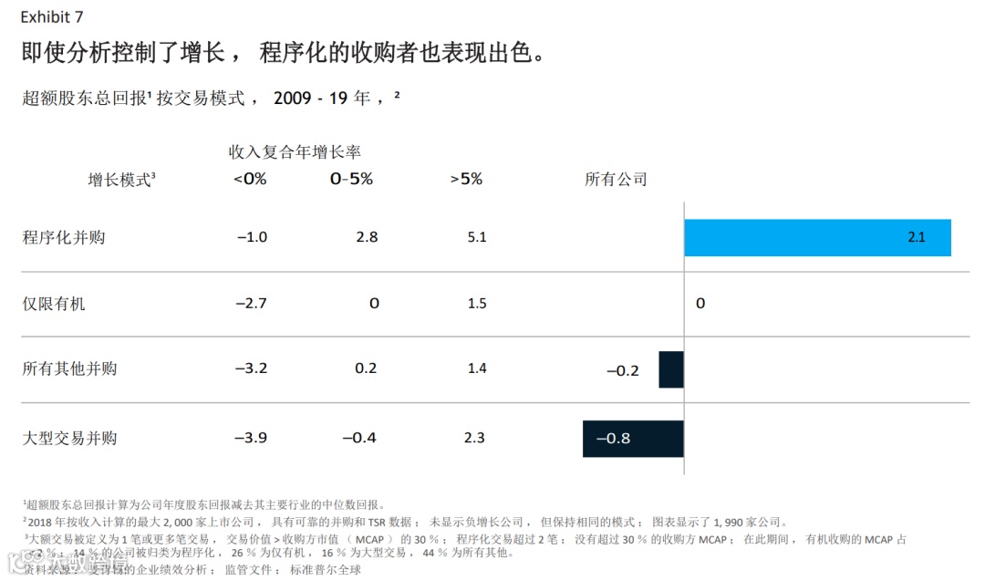 我们发现程序化并购者仍然比有机增长者表现更好。这表明,即使当公司的增长率与他们的收购同行相匹配时,他们也不太可能产生超过同行的股东回报(图7)。