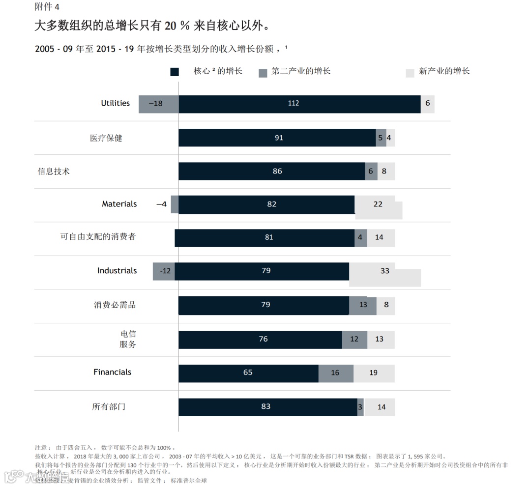 我们的研究发现,平均而言,80%的增长来自公司的核心行业,其余 20 %来自第二产业或向新产业的扩张(图表 4 )。