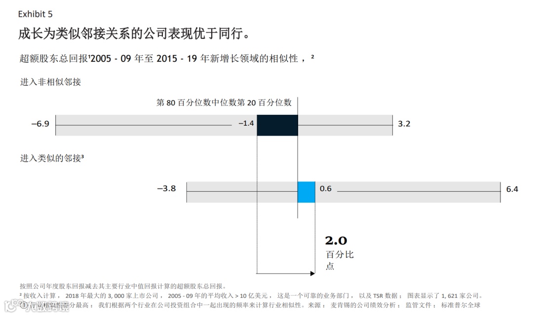 我们的分析表明,以增加投资组合相似性的方式增长的公司平均每年可获得额外一个百分点的 TSR 。如果新行业与其核心相似,则扩展到新行业的公司可以期望额外两个百分点(图表 5 )。