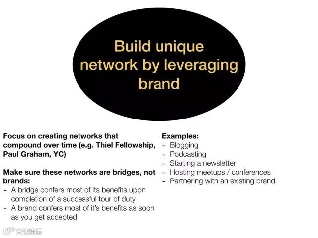 利用品牌来打造独特关系网络:专注于建立会逐渐产生复合效应的关系网络。确保这些网络能成为桥梁而不是品牌。所谓桥梁是指大部分好处是在过程成功结束后兑现的。而品牌是指大部分好处是在你得到认可后兑现的。