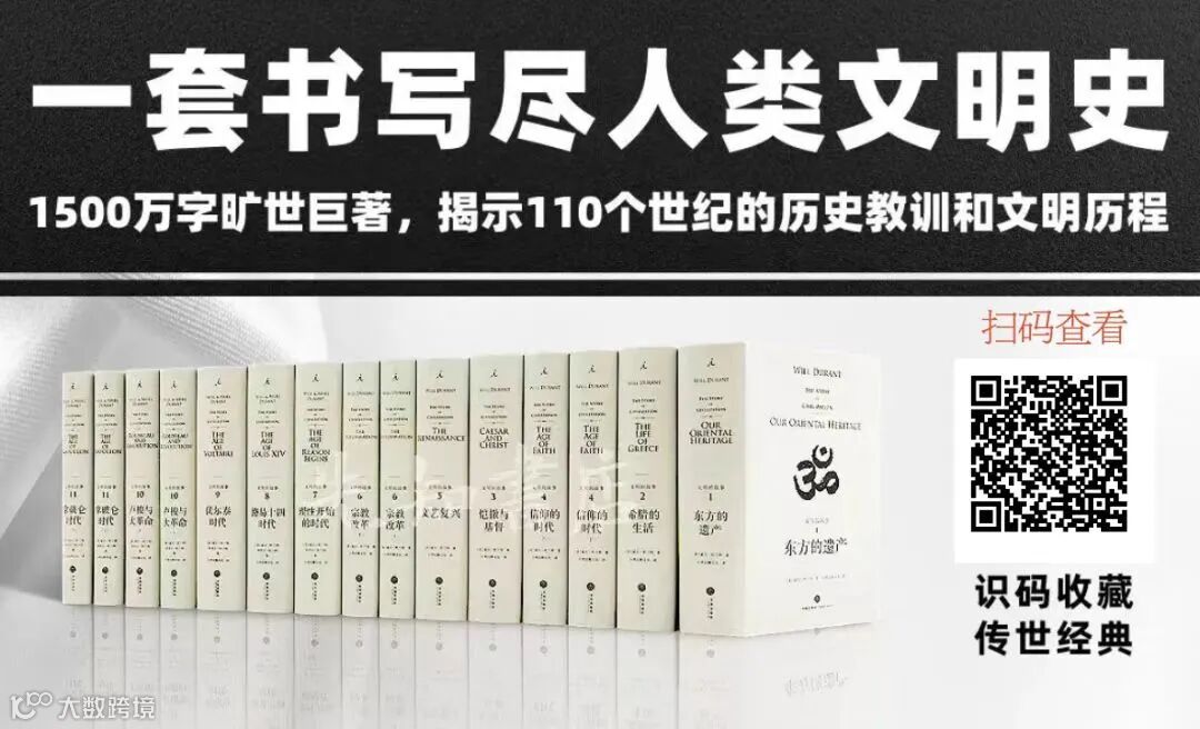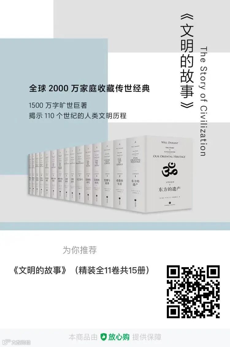内容是公认的经典,颜值亦无可挑剔,内文有近千幅珍贵历史图,装帧极为典雅。无论是犒劳自己,还是赠送亲朋,这套大部头都对得起不趋流俗的读书人!长按下图,识别图中的二维码,即可购买收藏杜兰特《文明的故事》(还可在规格中一并选购“杜兰特作品集”)。
