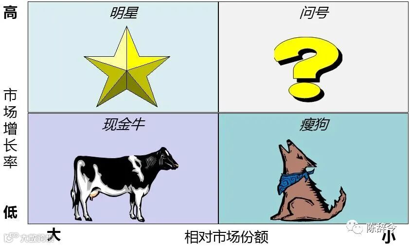 金牛:在低增长市场上具有相对高的市场份额的业务将产生健康的现金流,它们能用于向其他方面提供资金,发展业务。